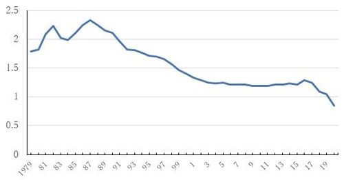 2020年の出生者数は1200万人、人口出生率は0.85%と1952年の統計開始以来過去最低となった(図表1参照)。