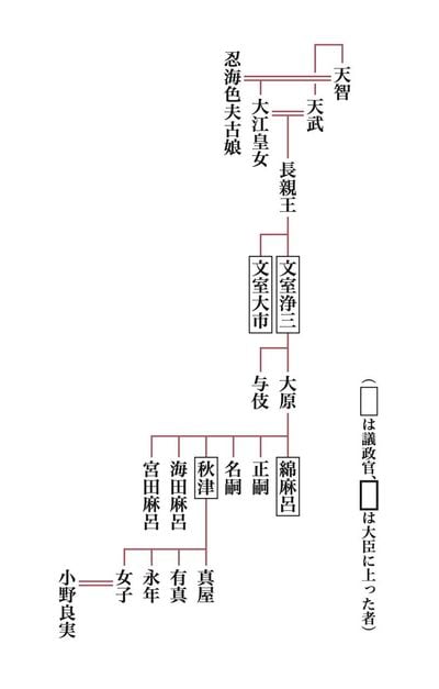 浄三の子・大原(おおはら)は備前守で終わったが(なお、大原は姓を三諸〈みもろ〉朝臣に替えている)、その一男の綿麻呂(わたまろ)は征夷将軍として名高い。綿麻呂の弟で大原の四男が秋津である。なお、末弟の宮田麻呂(みやたまろ)は、筑前守として任地にあった承和八年(八四一)、新羅人張宝高(ちょうほうこう)と関わりを持って国際交易に手を出し、承和十年(八四三)に謀反を告発されて伊豆国に配流され、配所で没している。