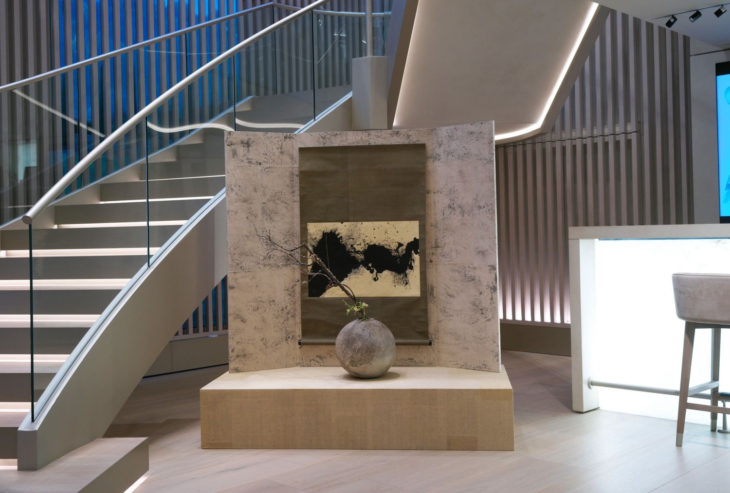たとえば、照明。乳白色のやさしい光を放つオパリンガラスのライトは、古い紙のランタンを着想源とし、この店舗のためにイタリアで制作したもの。木製の鎧戸のような装飾は、ルーバーウォールと呼ばれるが、日本の障子をイメージして作られている。壁紙にはジュート(麻)にセメントを重ねた独特の質感があるが、これも掛け軸にインスパイアされたものだ。