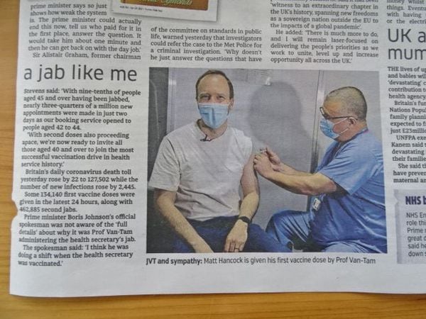 ヴァン=タム次席医務官からワクチンの接種を受けるハンコック保健相の様子を報じた地元紙の記事