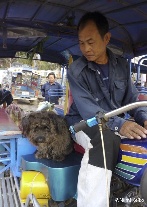 犬が駆け出して飛び乗ったのは、お菓子屋さんのご主人のトゥクトゥク(三輪タクシー)でした。朝のこの時間はトゥクトゥクの営業ではなく、子どもを学校に送ったり、お年寄りの家に野菜や食べ物を届けたりしています。この犬は朝の配達の時間だけドライブに同行します。