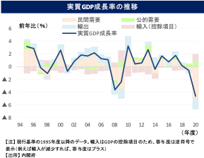 2020年度の実質GDPは前年度比▲4.6%となり、2年連続のマイナス成長へ陥った。落ち込み幅は、リーマン・ショックのあった2008年度の▲3.6%を超えて戦後最大である。2020年度の日本経済を振り返れば、新型コロナウィルスの感染拡大を抑えるため、急激な縮小を余儀なくされた。コロナ禍対策のため公的需要が拡大したものの、個人消費など民間需要や輸出の急激な縮小を補うには至らなかったということだ。