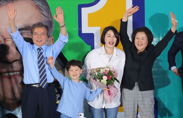 2017年5月、大統領選の投票日前日、最後の演説で支持を訴える文在寅氏(左)と家族(写真:YONHAP NEWS/アフロ)