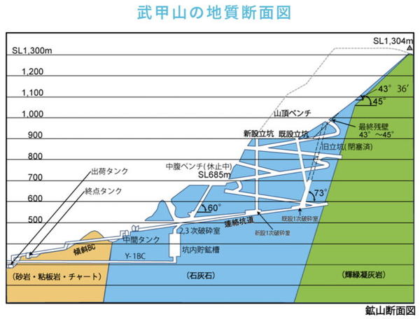 武甲山の地質断面図(出典:秩父石灰工業のホームページ