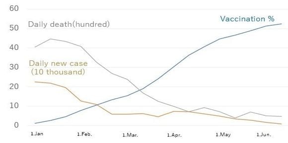 図は2021年の1月から6月にかけての米国全土でのワクチン接種率と、新型コロナウイルスの新規感染者、死亡者の変化をグラフにまとめてみたものです。