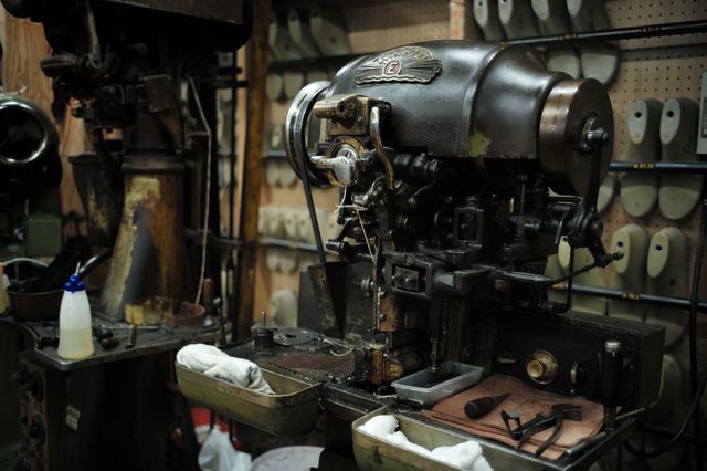 古いが美しく整備された、底付け用のマシン。この工房では、靴の用途に合わせてノルウィージャン、ステッチダウン、セメントという3つの製法を使い分けている
