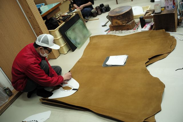 大手メーカーはCADを使ってレーザー裁断するのが主流になっているが、こちらのレザーはなんと手裁断! 高価な革を無駄にしないよう、知恵が求められる