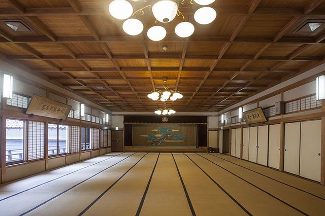 名建築として館内は見所が満載で、特筆すべきは文化財のひとつの大広間だ。格天井は今では再現できないと言われる桐の柾目一枚板を使用し風格がある。