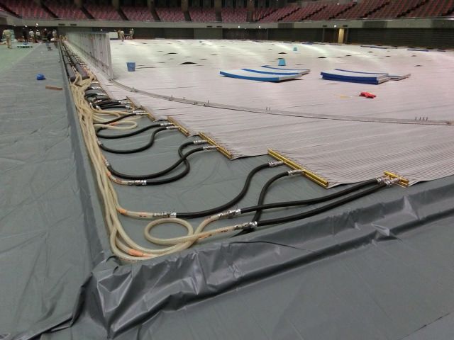 常設リンクはスケーターが日々活動するのと同様、毎日のメンテナンスが欠かせないし、大会やアイスショーなどの、仮設リンクであれば、氷を張って期間中維持しメンテナンスする作業が求められる。とりわけ仮設リンクの場合、ふだんは氷と縁のないところをリンクに早変わりさせるのだ。どのように作っているのか、不思議に思うのは自然だ。