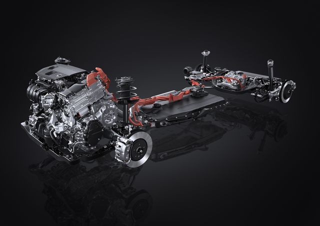 新型NXの最大のトピックは、レクサス初となるPHEV(プラグインハイブリッド)を含むパワートレインがなんと6種類も用意されている点でしょう。「2.5L PHEV E-Four」はリヤに後輪を駆動するためのモーターを備えた4WDで、満充電の状態から約80kmものEV走行が可能。駆動用のリチウムイオンバッテリーはフロア下に置き、低重心化を図って安定感のある走りが特徴だそうです。