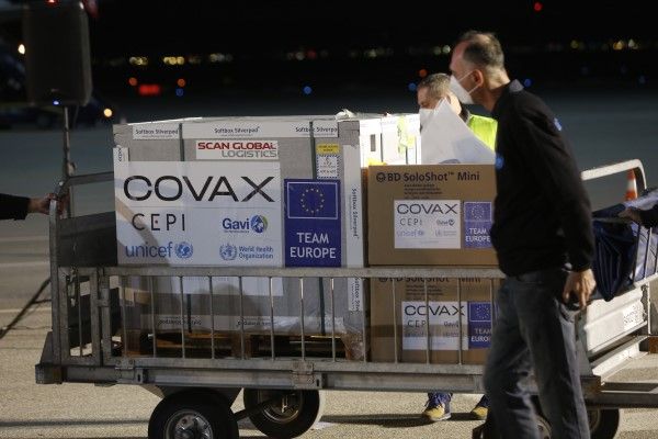 COVAXシステムを通じて提供され、コソボの空港に到着したアストラゼネカワクチン(写真:AP/アフロ)