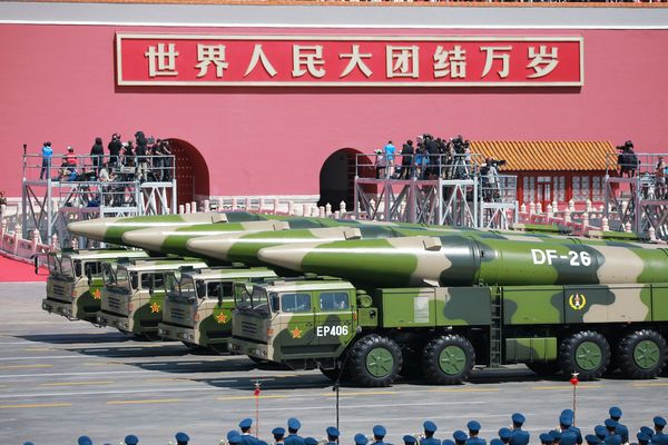 中国人民解放軍の中距離弾道ミサイル「DF-26」(2015年9月3日、写真:アフロ)
