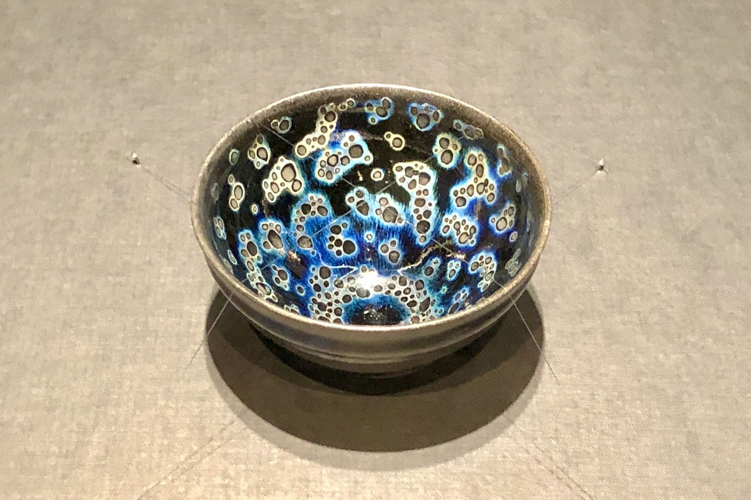 天目茶碗はふつう窯で焼くと黒や褐色に発色する。ところが、何らかの条件が整ったとき、ごく稀にこのような美しい瑠璃色を生み出す。意図して出そうとしても容易に実現することのできないもので、人智を越えた自然の奇跡ともいうべきものなのだが、意外なことに、生産地の中国では必ずしも高く評価されていなかったとこれまでは考えられてきた。