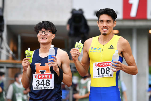 2021年6月26日、日本選手権男子400mハードル、左から優勝した黒川和樹(法大)、2位の安部孝駿(ヤマダホールディングス) 写真=松尾/アフロスポーツ