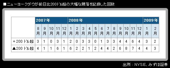 筆者が作成している前日比200ドル超の騰落日数カウントでも、今年に入ってからは1月が「3勝4敗」、2月が「2勝3敗」で、負け越し続き。米大統領選が行われた昨年11月以降を見ても、勝ち越しになった月はない。景気楽観論が強まる場面、いわゆる「オバマ期待」相場をつくりだすことさえも実現困難なのが実情と言える。サブプライム危機と言われた2007年8月以降を見ても、勝ち越した月は、2008年3月、4月、8月の3つしかない。