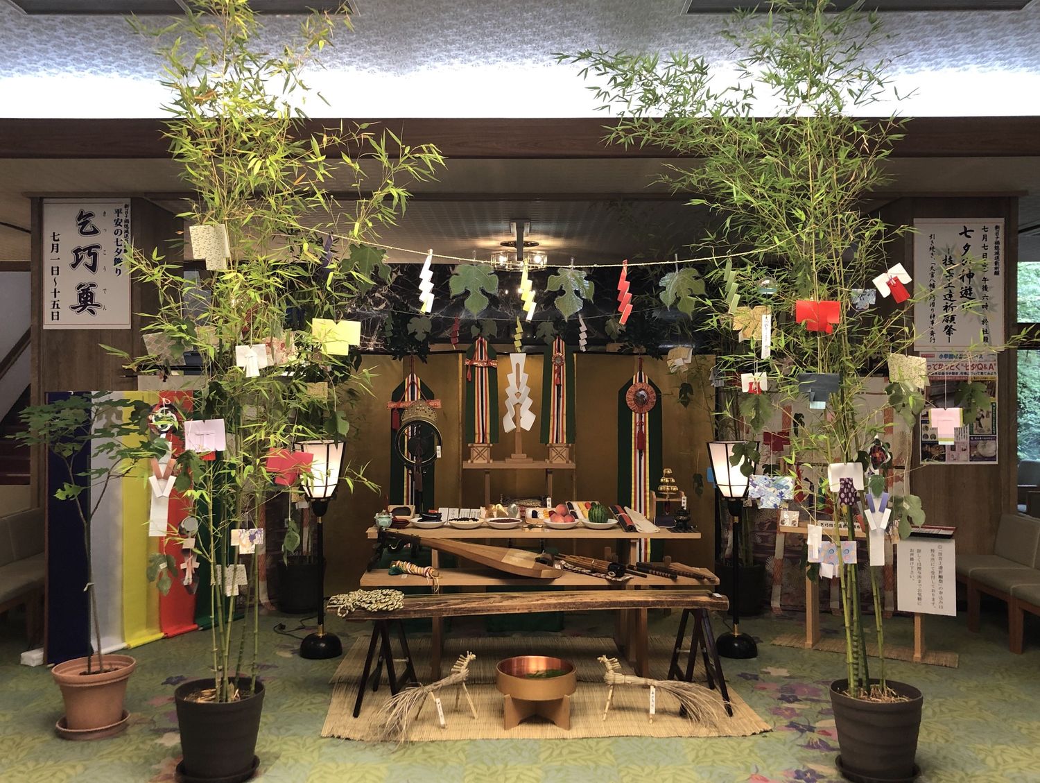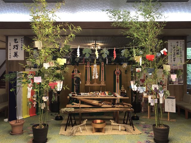この神社は、季節ごとに、祭や古式ゆかしいイベントを開催してくれることでも人気が高い。わたしが特に好きなのは、七夕に関する一連の行事だ。毎年7月1日~15日には、清涼殿のロビーで「乞巧奠(きっこうでん)飾り」と呼ばれる平安時代の宮中で行われていた七夕飾りを再現した展示を見ることができる。これは、短冊のルーツと言われる梶の葉や五色の紙垂などを飾り付け、技芸の上達を祈る行事だ。また、神門前には大宮八幡乞巧奠潜りが設けられ、実際にこの下を潜って祈願をすることもできる。