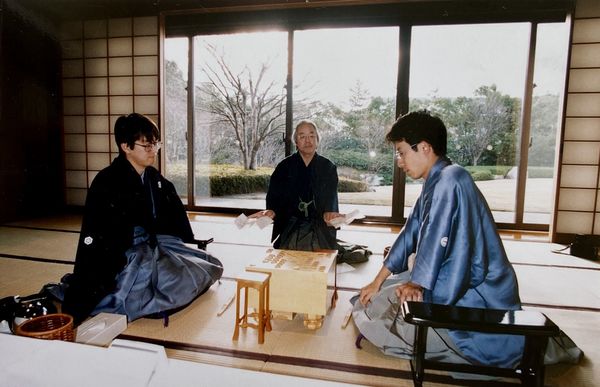 1998年、王将戦第2局。左から、羽生善治王将(当時27)、立会人の田丸八段(同47)、佐藤康光八段(同28)。2日目の9時の開始時には、両対局者が1日目の指し手を並べた後、立会人が封筒を開封して封じ手を読み上げ、両対局者に図面用紙を提示する。佐藤の封じ手は想定内だったのか、羽生の表情に変化はない。写真提供=田丸 昇
