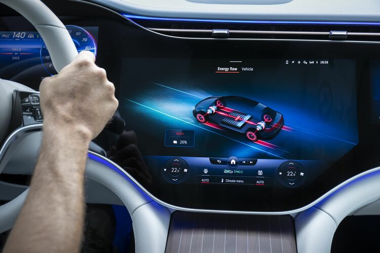 センターディスプレイはタッチ式の有機EL液晶で、ナビの他にほとんどすべての装備をここでコントロールする。写真は回生ブレーキ作動中を示す(EQS580)