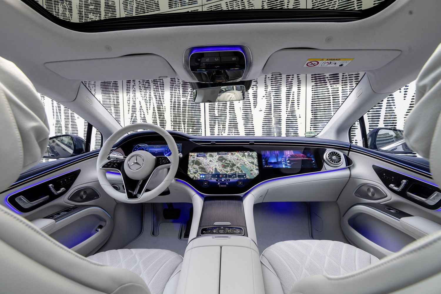 ダッシュボード全面に広がるハイパースクリーンには、メーターパネル、センターディスプレイ、助手席用ディスプレイの3枚が仕込まれている