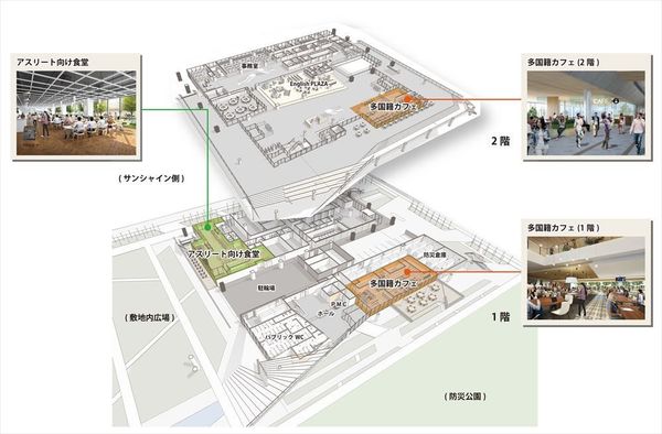 具体的には、地上2階レベルを多様な人々が交流する「ステージ」と位置付けてアトリウムやカフェなどを配し、その上にオフィスビル型の超高層をつくる。1~2階にあるカフェや食堂は、学生だけでなく、地域の人々も利用できるものとする予定だ。2階のステージには、公園方向からも緩やかな階段で上れる。2階の一部から上は学生だけが利用できるセキュリティーゾーン。低層棟の屋上や、超高層の中間部分には、学生のためのステージ(交流スペース)も設ける。