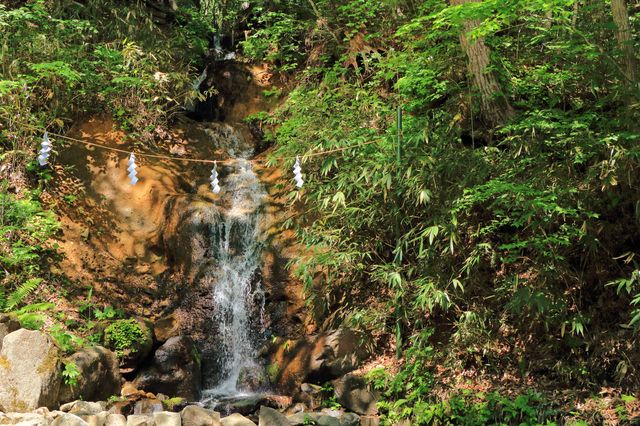 境内は他の社より広く、パワースポットと言われる場所がいくつかある。まずは、樹齢約700年のご神木や、鳥居を中心とした三角形にそびえ立つ樹齢800年の三本杉などが目につく。もうひとつ有名なのは、社殿の右奥にあるさざれ滝である。山の湧水が流れ落ちる小さな滝で、この水しぶきを浴びると、心身が清められ、パワーをいただけるとのことだ。