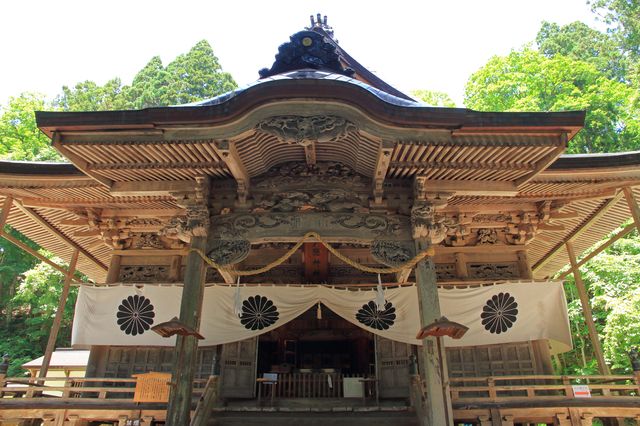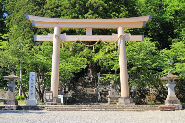 麓から登っていくと、まず宝光社がある。祭神は天表春命。中社に祀られている天八意思兼命の御子神で、開拓、学問技芸、安産などの御神徳を持つ。270段の急な石段を登っていくと、荘厳な社があらわれる。杉木立に囲まれ、光が降り注ぐ神々しい空間だ。