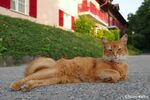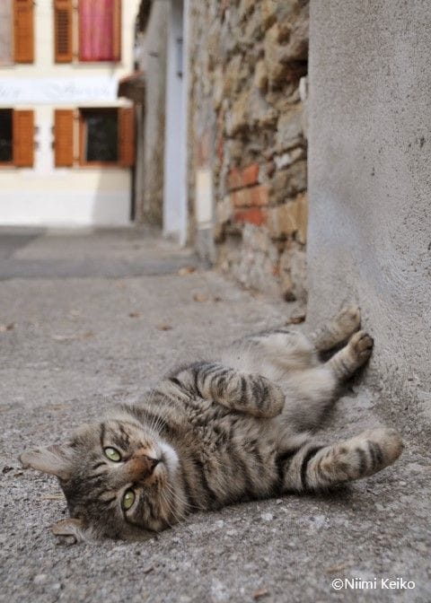スロベニアのアドリア海に面した小さな港町、コペルで出会った猫です。猫たちにはたいてい寝起きに見せるキメポーズがあります。この猫は、塀に沿って寝ていたのに、目を開けたとたん足を突っ張り「とおせんぼ〜」とばかりに伸びてきました。初めて会う人にキメポーズを見せるのは、「どれほど猫に理解がある人か、探ってやろう」と思っているからかもしれません。