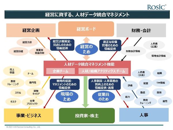 経営に資する「人材データ統合マネジメント」とは、「人事」という枠を超えて、企業内で発生している人や組織に関わる情報を統合し、包括的にデータ活用を行っていくというコンセプトだ。その実践には、既存の人事の枠を前提に考えるのではなく、経営企画や財務・会計、事業部(ビジネス)としっかり連携し、包括的にデータ活用を推進していく専任組織を立ち上げることが望ましい。