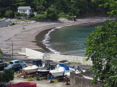 頼朝船出の浜伝承地。実際にこの場所から船出した可能性が高く、地形から見て頼朝は画面中央あたりで乗船したものと推定する。ちなみに冒頭の写真は、乗船推定地点から海を眺めたカット。頼朝も、このアングルで水平線を見ていたはずである。