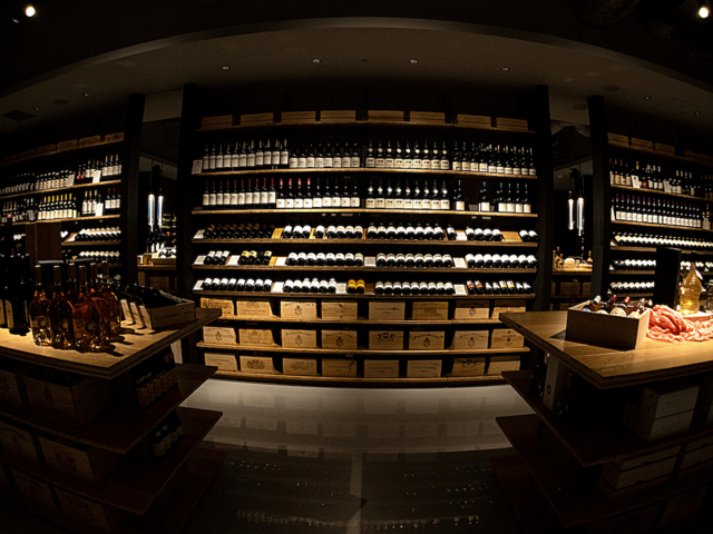 2021年7月28日にオープンした「CELLAR DOOR AOYAMA」。店内はプラスチックをほぼ、使っていない。奥の壁はワインセラーがビルトインで、ペトリュスはじめ、超高級ワイン。扱うワインは、ジェロボーム、およびその子会社のワインダイヤモンズが輸入したもの