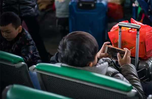高速鉄道の待合室でモバイルゲームに熱中する少年(2019年に筆者撮影)