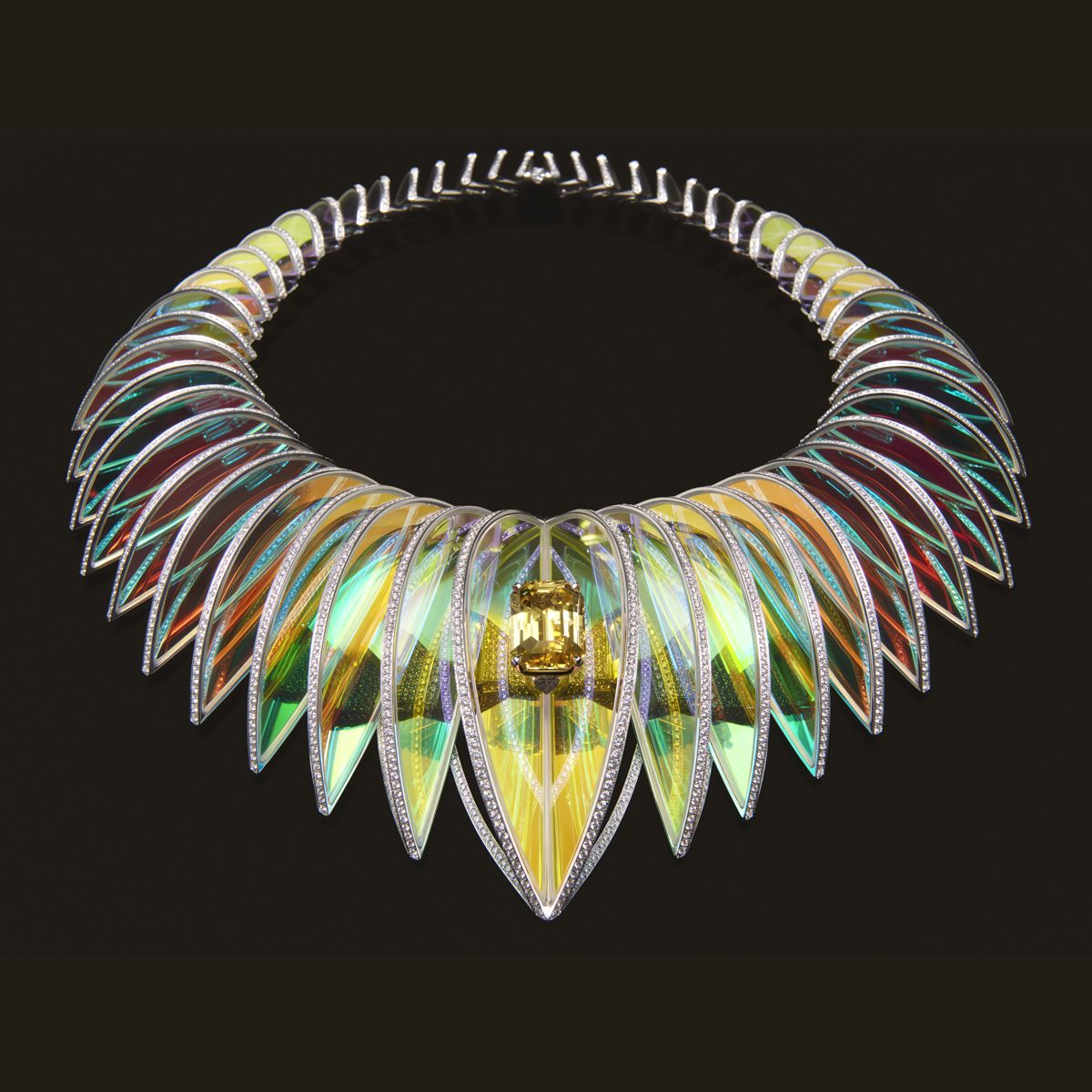 「ホログラフィック」ネックレス。WG、ダイヤモンド、スリランカ産イエローサファイア(20.21カラット)、ホログラフィック ロッククリスタル。7128万円(予定価格)。© Boucheron