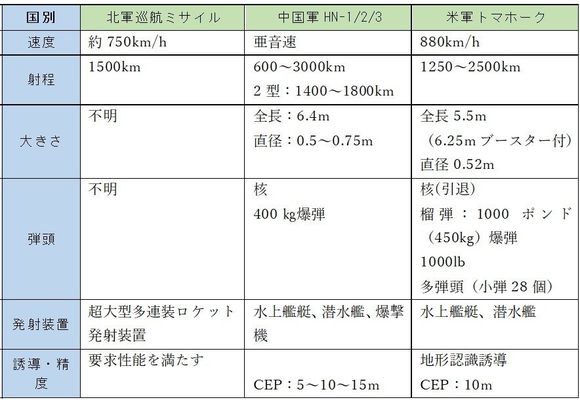 北朝鮮と中国軍・米軍の長距離巡航ミサイルの性能諸元