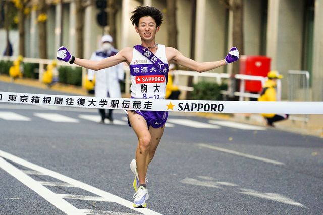 2021年1月3日、第97箱根駅伝復路。トップでゴールする駒澤大の石川拓慎 写真=アフロ