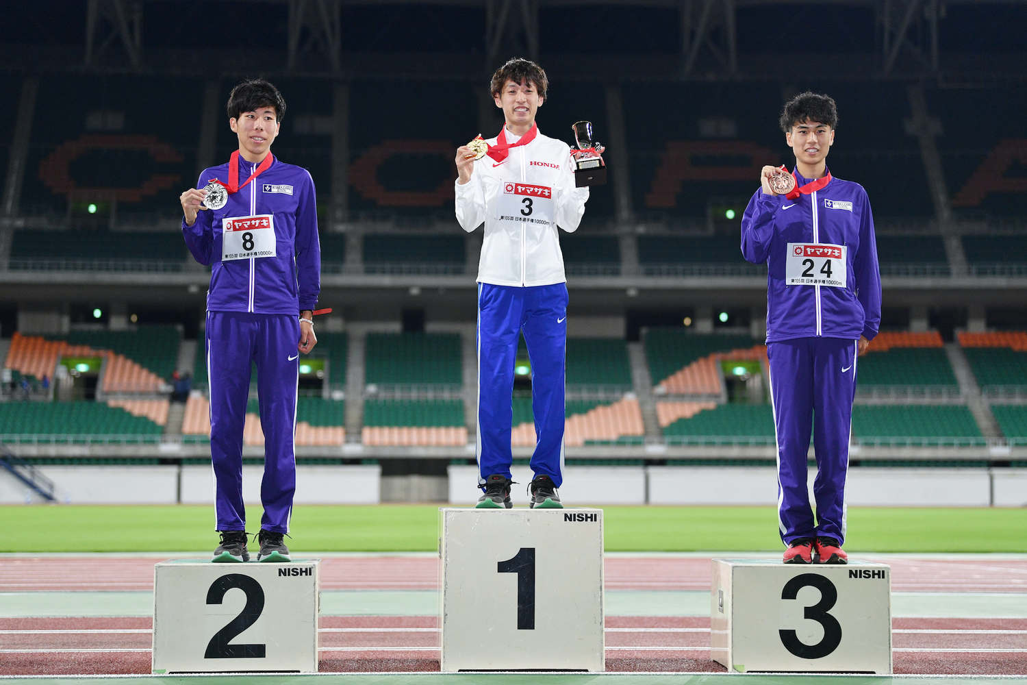 2021年5月3日、日本選手権男子10000m表彰式。左から、田澤廉、伊藤達彦、鈴木芽吹 写真=松尾/アフロスポーツ