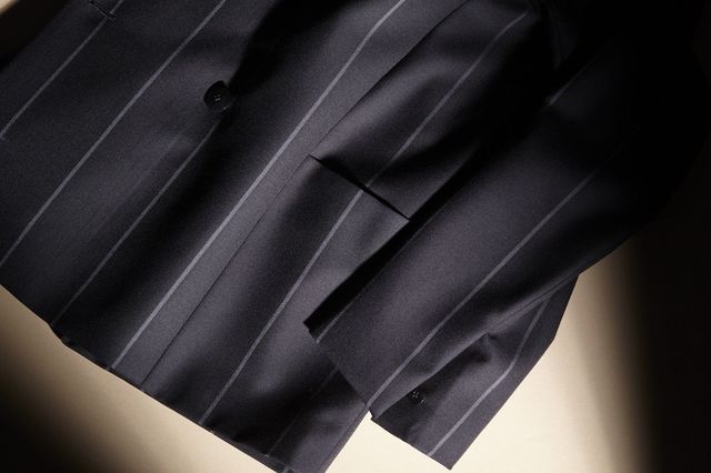 ジャケットの細腹(さいばら=サイドパネル)と一体化させることで、存在を感じさせないポケット。ストライプ柄が一直線でつながっているのは、〝エルメネジルド ゼニア〟ならではの高度な仕立て技の賜物
