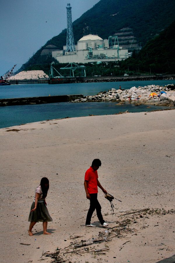 美浜原発の向かいの海水浴場は都会からやって来る若者や親子連れで賑わっていた。目を上げた対岸には真っ白な原発が夏の光に輝いている。