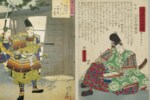 歌川芳虎『大日本六十余将』の平維盛(左)と、右田年英の平忠度