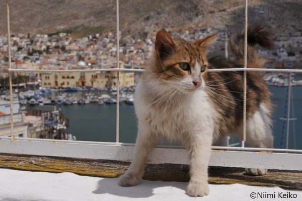 ギリシャ東部のドデカネス諸島にあるカリムノス島でフェリーを降り、町の方へ歩いていくと、知らず知らずのうちに高台へ登っていました。港がよく見えます。そのとき、不意に猫が目の前に現れて、びっくり。