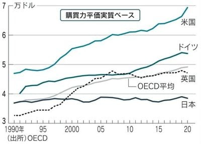 その原因は、物価が上がる代わりに賃金が下がったからだ。図1のように、購買力平価でみると、この30年でOECD諸国の年収は1.5倍になったが、日本はほとんど変わっていない。だがこの間に日本の物価もほとんど上がっていないので、賃金単位でみると日本の物価は世界水準と変わらない。