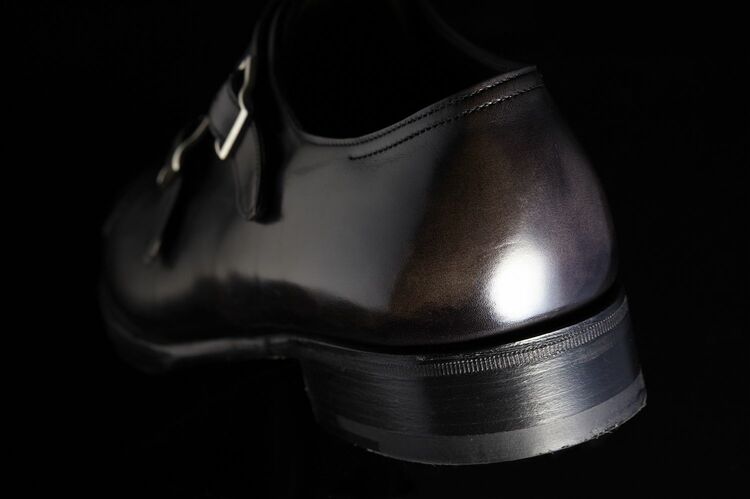 手仕上げでムラを演出した艶っぽいカーフや、美しく磨き上げられたメタルのバックルだけに見惚れていると、この靴の真骨頂には気付けない。なんとこの靴、サイドにもヒールにも継ぎ目が見当たらない。中心をくり抜いたような形状の一枚革で仕立てた、いわゆるホールカットなのである!