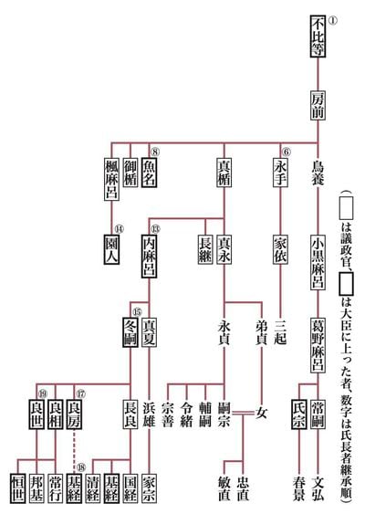 藤原房前(ふささき)三男の真楯は、天平宝字八年( 七六四) には中納言にまで上っていた。真楯を妬(ねた)んだ藤原仲麻呂(なかまろ/恵美押勝〈えみのおしかつ〉) がこの年に滅び、真楯も道が開けるかと思われたが、大納言兼式部卿で死去している。真楯長子の真永(まなが)は『尊卑分脈』にしか見えない。二男の長継(ながつぐ)は宝亀(ほうき)三年(七七二)に叙爵されたが、内兵庫正(うちのひょうごのかみ)で終わっている。三男の内麻呂(うちまろ)は、右大臣にまで上った。内麻呂の子に冬嗣(ふゆつぐ)がおり、後の摂関家につながっていくことになる。