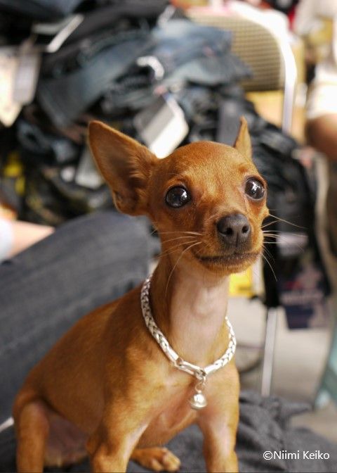 ジーンズなどカジュアルな衣料品店の店先。遠目に猫が見えたように思ったので近づいてみると、商品の上にいたのはまだ若いチワワでした。素敵なネックレスですね。