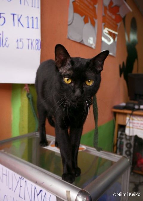 黒猫の名前はメンです。スマートフォン販売代理店の店先にいつもいます。店主の若い男性は、猫を紐でつないでいます。「黒猫がラッキー・キャットということは誰でも知っているから、盗まれてしまわないかと心配でならないんだ。この店が順調なのもメンのおかげ。優秀な招き猫だね」と、話してくれました。