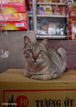 食料品店の店先でお手伝いをしていた猫です。「インスタント麺の警備は任せてね」と、胸を張っているように見えました。