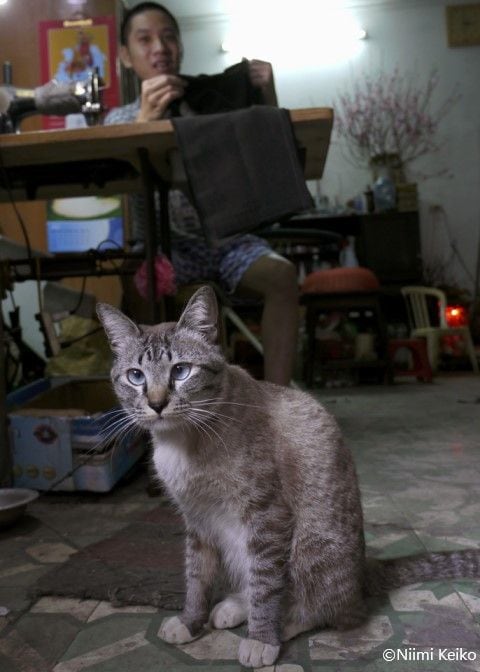服のリフォームを請け負っている路地裏の家です。家の中が暗いので、少しでも陽を浴びさせたいと、玄関に猫をつないでいるそうです。「なぜ、猫をつないでいるのですか」と尋ねれば、「つないでなかったら、どこかへ行ってしまって、迎えに行くのが大変だから」という答えが返ってきました。