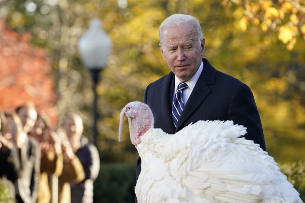 七面鳥と一緒に映るバイデン大統領。感謝祭の前に開催されるセレモニーに参加した時の様子(写真:AP/アフロ)