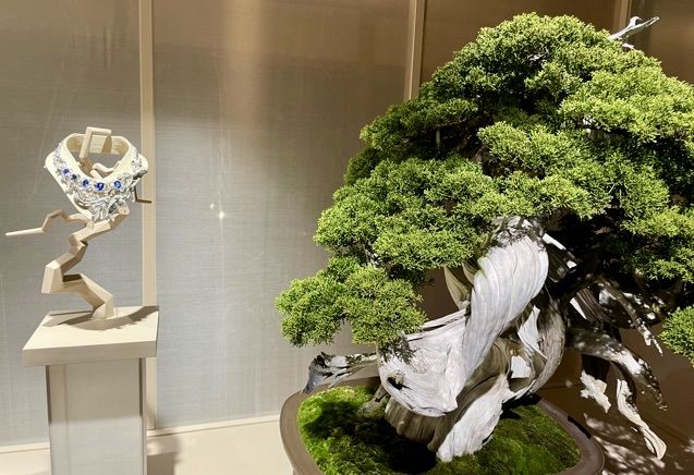 一方のショーメは、数十億年も大地の奥底で眠っていた石を選び抜き、カットし、磨き上げ、未来に引き継がれる永遠の価値を与える。石に人の手を加えるラピデール(宝石細工)の技によって幻想的な輝きが引き出されたジュエリーが、盆栽に並置される。