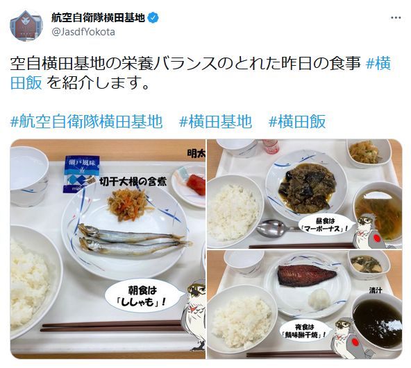 2021年11月16日、空自横田基地の公式ツイッターアカウントが1日の食事を紹介して話題となりました。