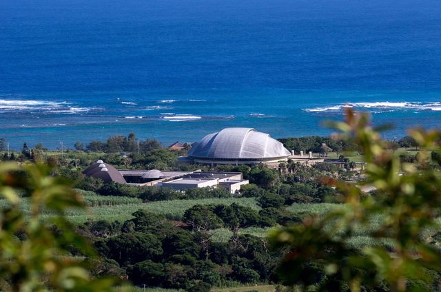 美術館は奄美大島の海をイメージしてつくられた池の上に高倉を模した展示室が建ち並ぶ